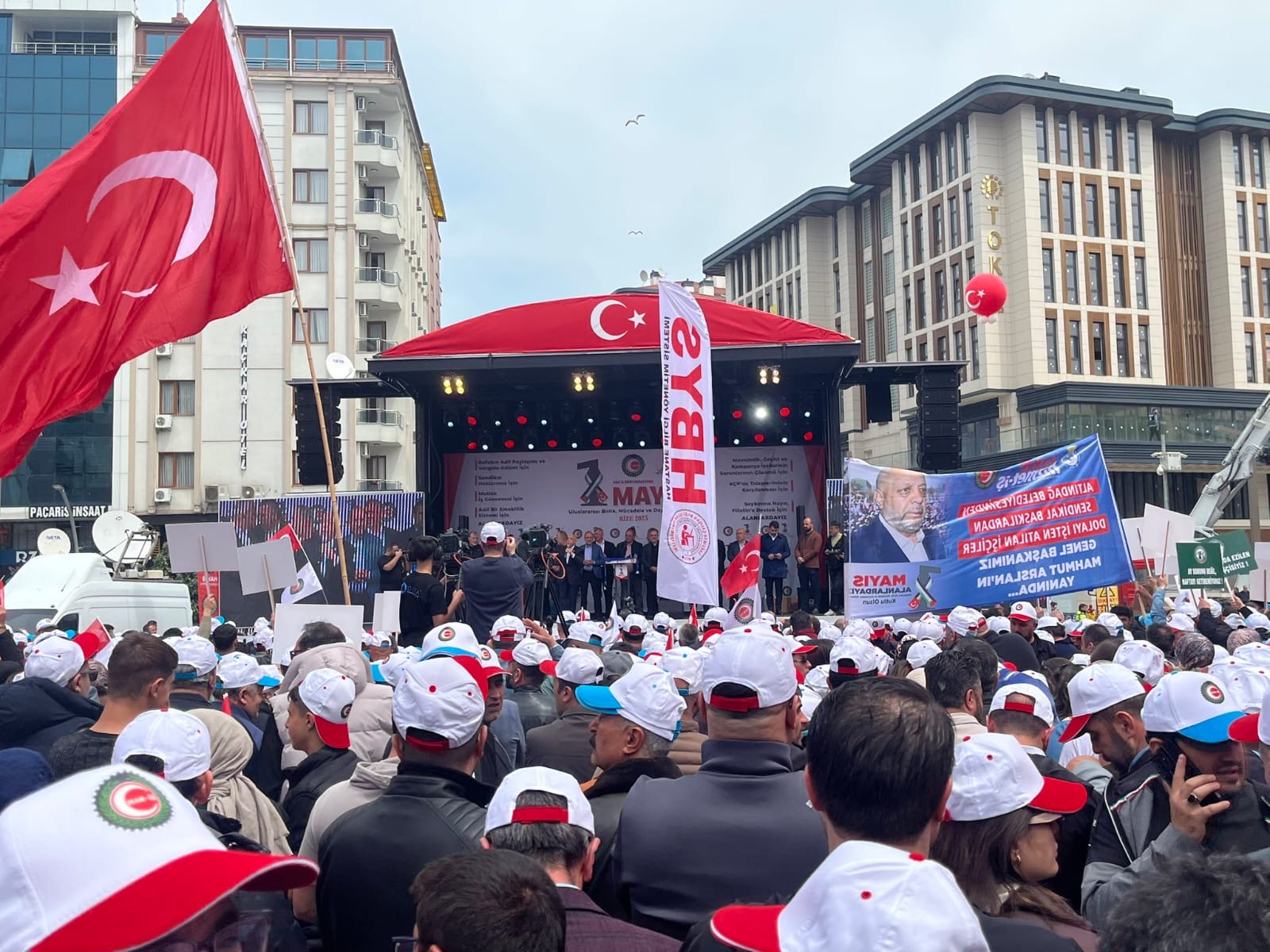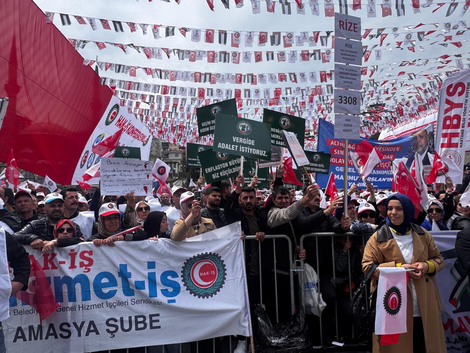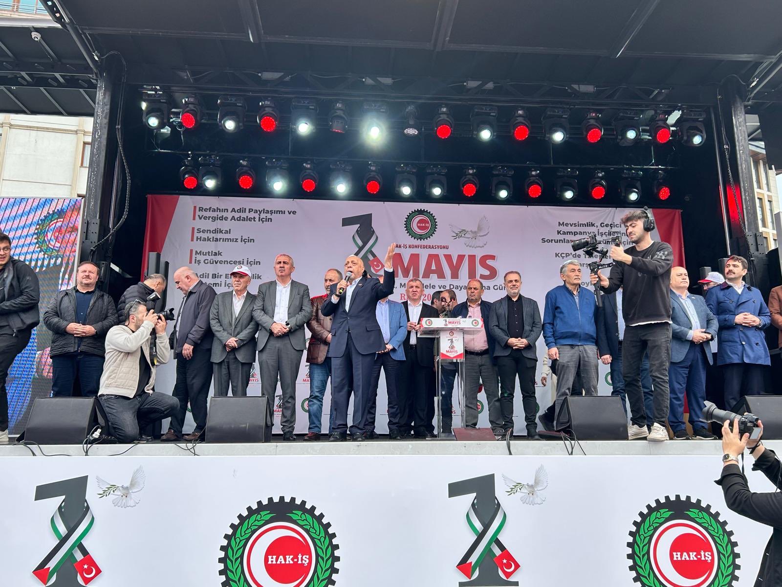Binlerce HAK-İŞ emekçisi tarafından alanda “Yaşasın HAK-İŞ, Yaşasın 1 Mayıs”, “Vergide Adalet”, “HAK-İŞ Nerede Biz Oradayız”, “Filistin’e Selam Direnişe Devam “sloganları atıldı.