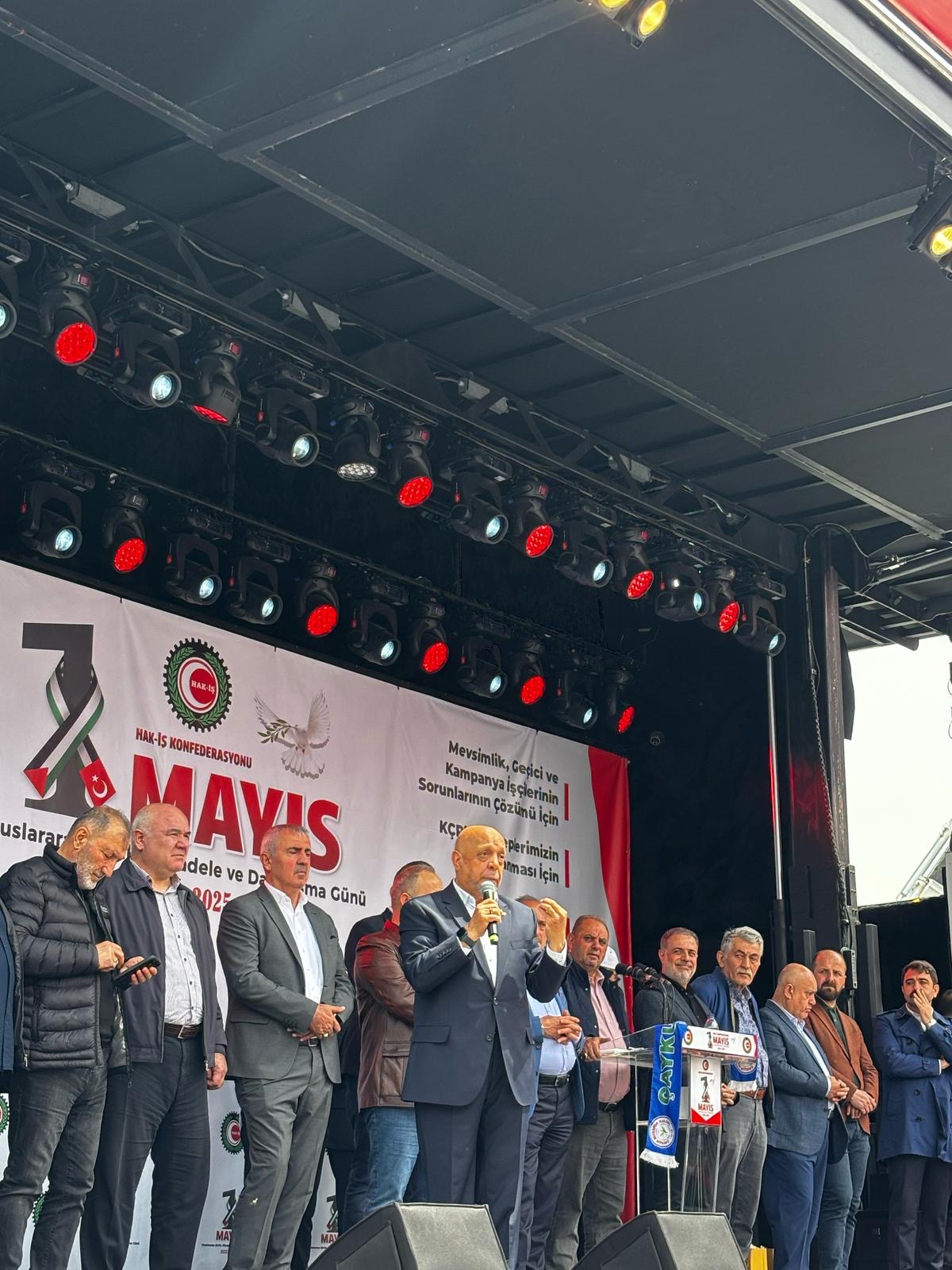 1 Mayıs miting alanında “Ücretlerden Alınan Vergi Oranları Düşürülmeli” , “Sendikal Örgütlenmenin Önündeki Engeller Kaldırılmalı” , “Refahın Adil Paylaşımı ve Vergide Adalet Sağlanmalı”, “Mevsimlik Geçici ve Kampanya İşçilerinin Sorunları Çözülmeli”, KÇP’de Taleplerimiz Karşılanmalı”, “Adil Bir Emeklilik Sistemi Sağlanmalı”, Mutlak iş Güvencesi İstiyoruz”, “Soykırıma Hayır, Filistin’e Destek”, “Filistin Bizim Kırmızı Çizgimizdir”, “Gazze’ye Selam, Direnişe Devam” talepleri içeren büyük afişler yer aldı.