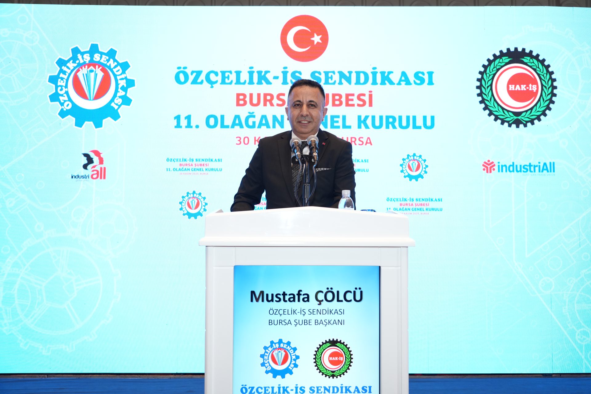 Genel Kurulda şube çalışmalarına ilişkin bir konuşma yapan Şube Başkanımız Mustafa Çölcü ise “Sevgili Genel Başkanım, sizlere söz veriyoruz; Örgütlenmeye hız verip, Bursa Şubemizi, dolayısıyla sendikamızı daha da büyüteceğiz. Sevgili Delege Arkadaşlarım sizlere söz veriyoruz. Yine Genel Başkanımızın liderliğinde genel merkezimizle birlikte birbirinden güzel toplu iş sözleşmelerini imzalayarak, dün olduğu gibi yarınlarda da sizlere hediye edeceğiz. Koltukların esiri olmadan, üyelerimize hizmet etmeye devam edeceğiz. Bizlerden hiçbir zaman desteğini esirgemeyen, bizleri ötekileştirmeyen, dışlamayan, bir baba şefkatiyle bizleri bağrına basan, tüm olumsuzluklara rağmen bizleri kucaklayan, gerçek dava adamı, gözü pek Liderimiz, Davamızı onurla taşıdığına şahit olduğum, omuz omuza yol yürümekten gurur duyduğum, Genel Başkanımız Sayın Yunus Değirmenci’ye bugüne kadar şahsıma, şubemize ve Bursa’daki üyelerimize verdiği destek ve katkılar için huzurlarınızda en kalbi duygularımla teşekkür ediyorum.”ifadelerini kullandı.