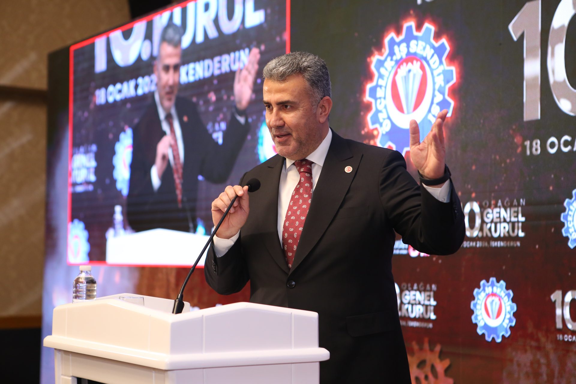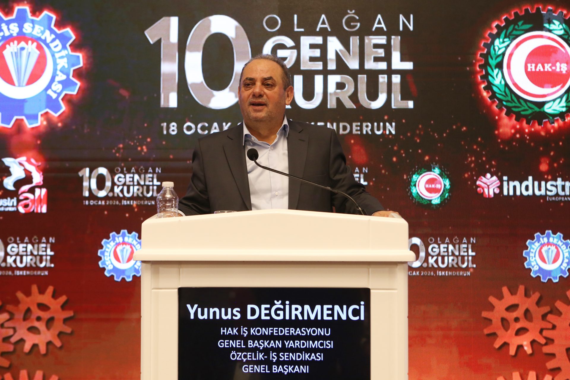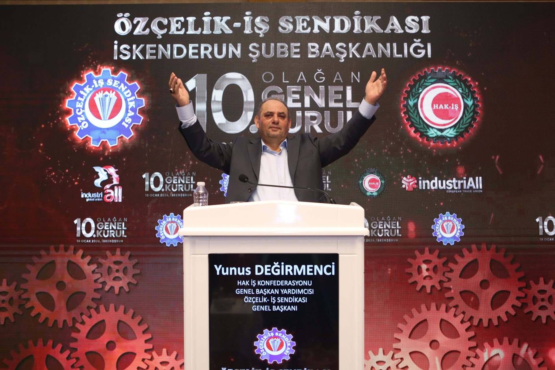 “İlk iş olarak, İSDEMİR’in yetkisini önce mahkeme salonlarında almayı başardık. Ardından sendikasına güvenini yitirmiş, geleceğinden umudunu kesmiş İSDEMİR emekçisini kazanmanın yollarını aradık. Kimseyi ayrıştırmadık, bütünleştirdik. Kimseyi dışlamadık, ötekileştirmedik, birleştirdik. İşçiye de, işverene de kendimizi anlatarak, açılmayan kapıları açıp, aşılamayan zorlukları aştık. Bu bölgede, şahsım ve Bayram Altun adına, asla mütevazi olmayacağım. Bugün dönüyorum, bu bölgedeki örgütlü işyerlerimize bakıyorum, dönüyorum bu salona bakıyorum ve Yüce Allah’a bir kez daha hamd ediyorum. Bu işçiye bizi mahcup etmediği için, binlerce kez şükürler olsun. Hayalini kurduğum, dualarımda yer ayırdığım bu kardeşlik ortamını, bu bölgede bizlere nasip ettiği için binlerce şükürler olsun.”